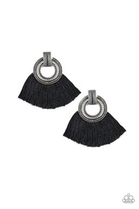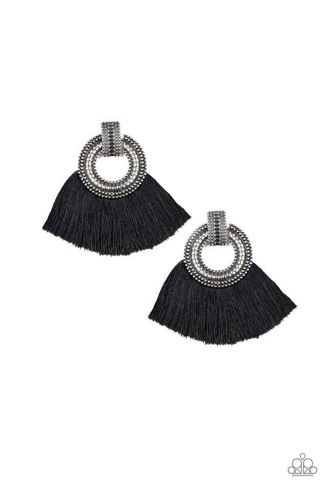 A plume of shiny black thread flares out from the bottom of an ornate silver fitting, creating a fierce fringe. Earring attaches to a standard post fitting.