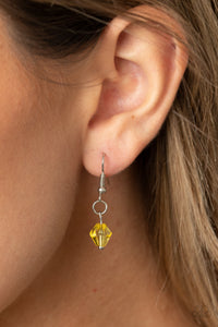 A whimsical tassel of silver leaf frames, yellow crystal-like beads, and shimmery silver chains cluster at the bottom of a lengthened silver chain for a colorfully seasonal look. Features an adjustable clasp closure.