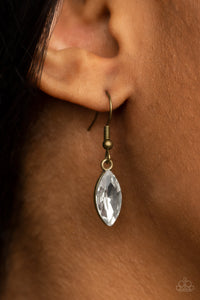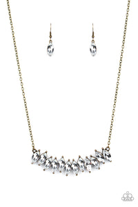 Featuring rustic brass frames, a regal row of marquise cut white rhinestones stagger below the collar, coalescing into an icy pendant. Features an adjustable clasp closure.