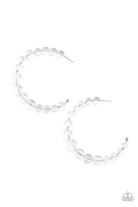 Gradually increasing in size at the center, a glassy collection of white beads are threaded along an oversized hoop for a bubbly effect. Earring attaches to a standard post fitting. Hoop measure approximately 2 1/2" in diameter.