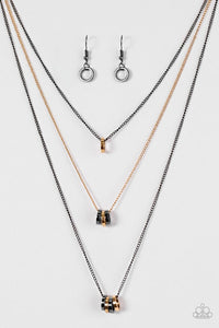 Dainty gunmetal and gold chains layer down the chest. Matching gold and gunmetal rings slide along the layers, creating a fierce mixed metallic palette. Features an adjustable clasp closure.