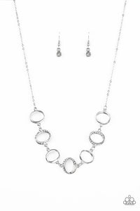 Glistening silver hoops link with white rhinestone encrusted hoops below the collar for a timeless shine. Features an adjustable clasp closure.
