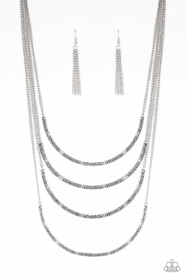 Embossed in ornate patterns, silver crescent frames layer down the chest for a statement-making look. Features an adjustable clasp closure.