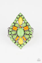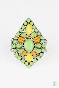 Featuring oval, round, teardrop, and marquise shapes, a vivacious collection of orange, yellow, and green beads are encrusted along the top of a silver frame, creating a colorful tribal centerpiece. Features a stretchy band for a flexible fit.