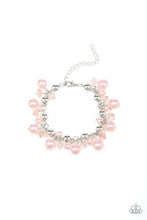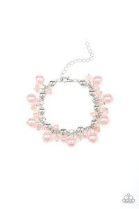 A refined collection of silver beads, pink pearls, and pink crystal-like beads cluster around the wrist, creating a timeless fringe. Features an adjustable clasp closure.