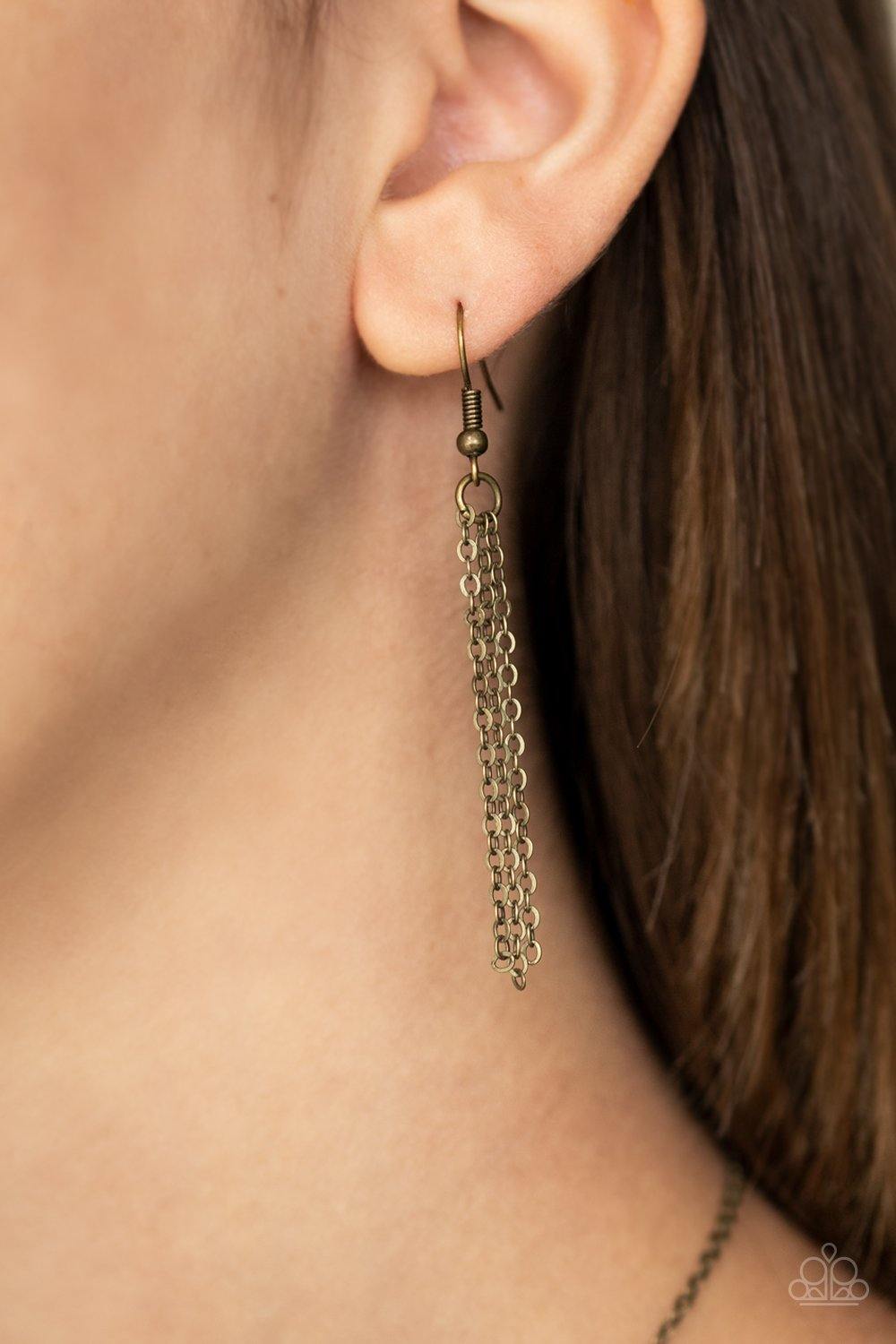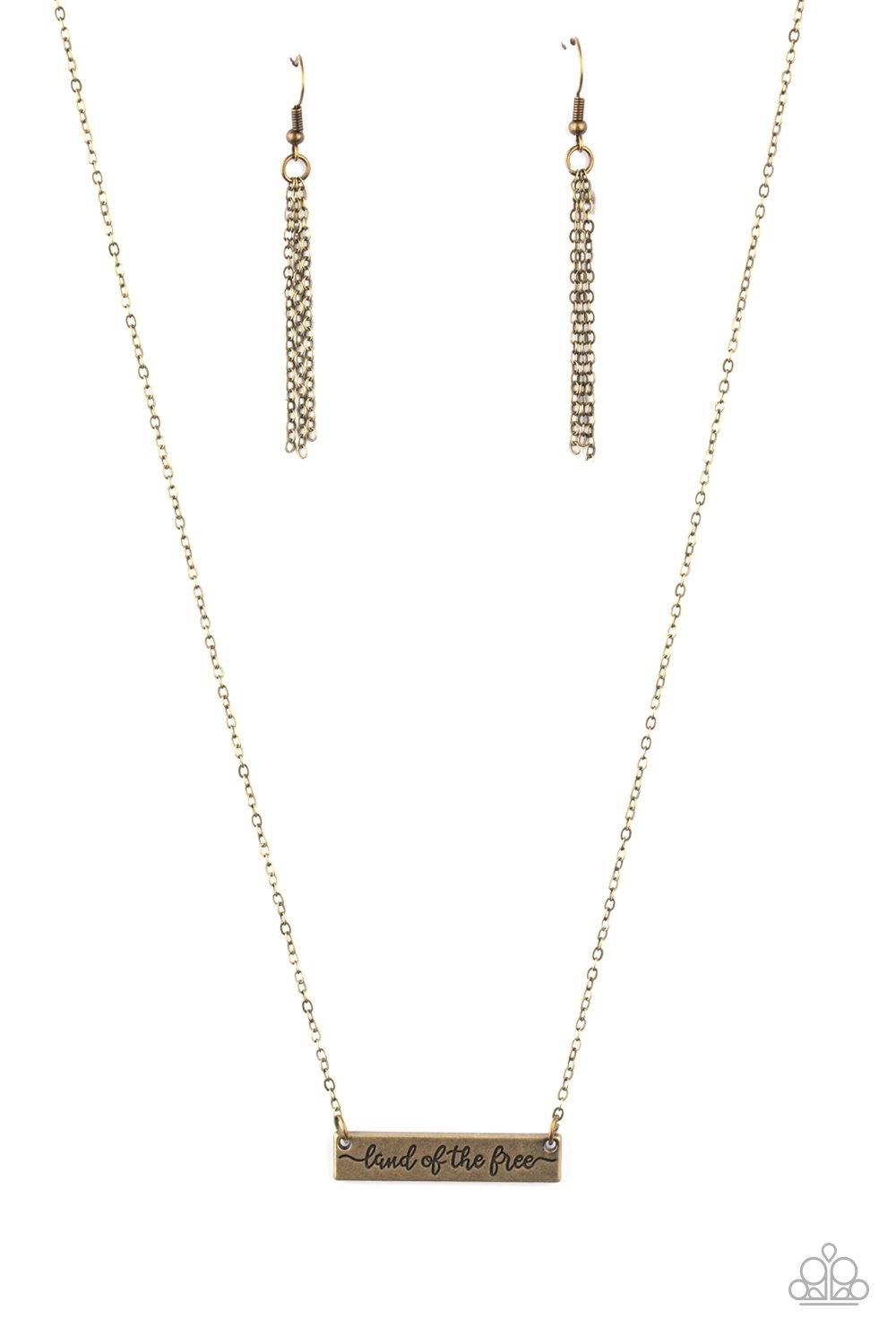 Stamped in the phrase, "Land of the Free," a brass rectangular frame is suspended by a dainty brass chain below the collar for a patriotic inspired look. Features an adjustable clasp closure.