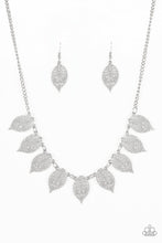 Swirling with dotted filigree, dainty silver leaf frames swing from the bottom of a glistening silver chain, creating a whimsical fringe below the collar. Features an adjustable clasp closure.