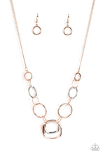 A mismatched collection of rose gold rings and asymmetrical silver hoops delicately links below the collar, resulting in a modern industrial display. Features an adjustable clasp closure.