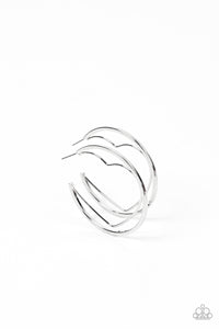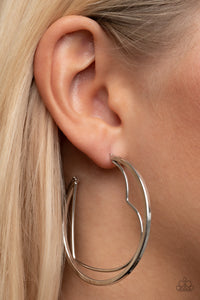 A silver wire heart is encircled in an oversized silver hoop, resulting in a heart-stopping shimmer. Earring attaches to a standard post fitting. Hoop measures approximately 2" in diameter.
