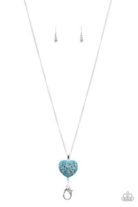 Brushed in a shiny blue finish, flowery filigree coalesces into a locket-like pendant at the bottom of a shimmery silver chain. A glassy white rhinestone dots the vintage inspired frame for a whimsical finish. A lobster clasp hangs from the bottom of the design to allow a name badge or other item to be attached. Features an adjustable clasp closure.