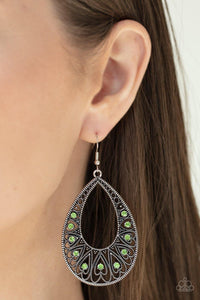 Dotted with dainty green rhinestone centers, studded silver heart frames fan out into a shiny silver teardrop frame for a lovable look. Earring attaches to a standard fishhook fitting.