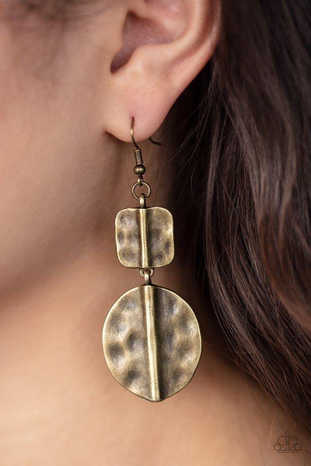 Brushed in an antiqued shimmer, a hammered square and oval brass frame have been threaded along a dainty rod, creating a handcrafted lure. Earring attaches to a standard fishhook fitting.