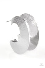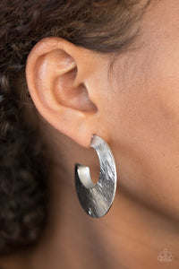 Featuring a high-matte sheen, silver frames join together, creating a bold hoop. Subtlety scratched in glistening shimmer, the asymmetrical frame swings from the ear in an edgy style. Earring attaches to a standard post fitting. Hoop measures 1 1/2" in diameter.