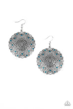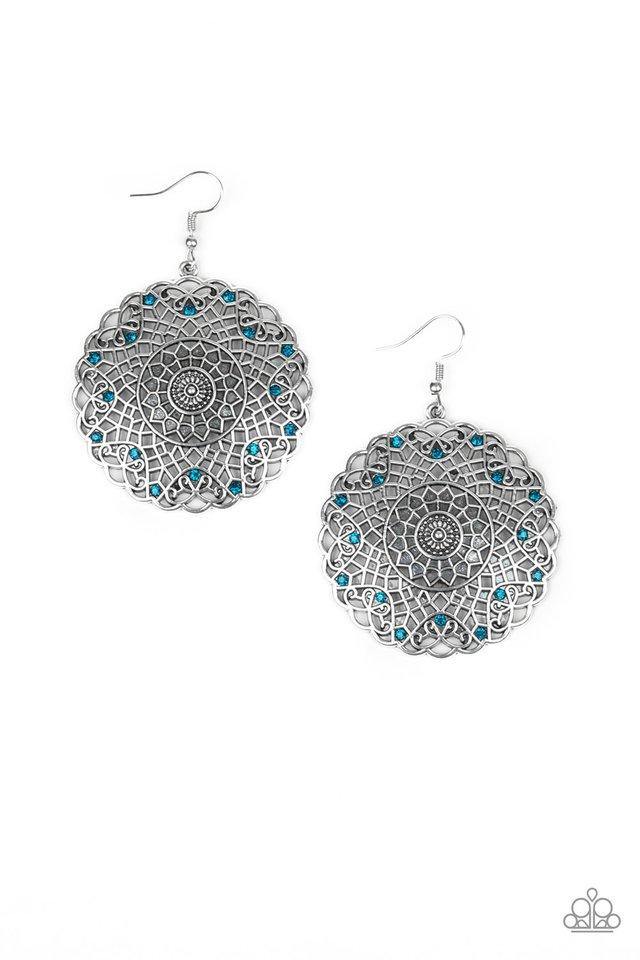 Featuring a flowery mandala-like pattern, a swirling silver frame is dotted with dainty blue rhinestones for a whimsical finish. Earring attaches to a standard fishhook fitting.