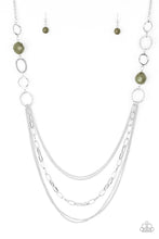 Faceted green beads and hammered silver hoops gives way to layers of mismatched silver chains for a whimsical look. Features an adjustable clasp closure.