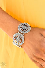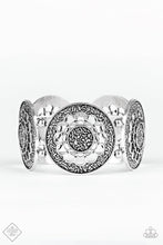 Separated by pairs of dainty silver beads, silver floral discs are threaded along stretchy bands that wrap around the wrist in a whimsical finish.