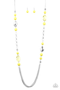 A collection of faceted silver, crystal-like yellow, polished yellow, and silver beads give way to layers of shimmery silver chains for a whimsical look. Features an adjustable clasp closure.