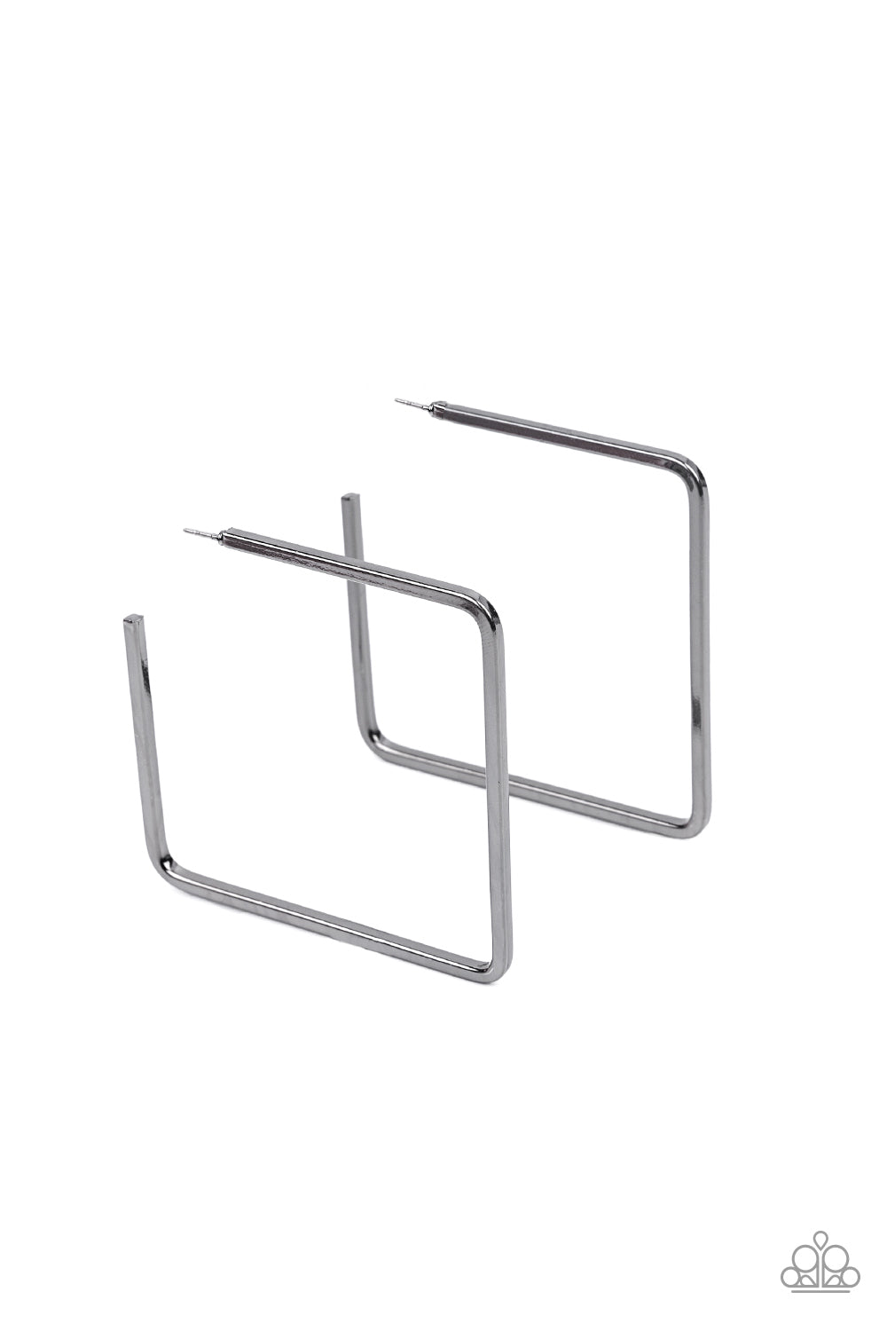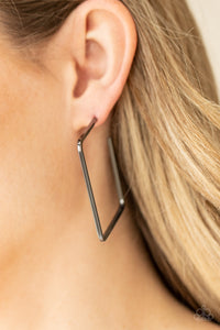 A deceptively simple square frame is tilted on point to create a geometric hoop. Its sharp angles are complemented by its rich gunmetal finish, making a lasting impression. Earring attaches to a standard post fitting. Hoop measures approximately 2" in diameter.