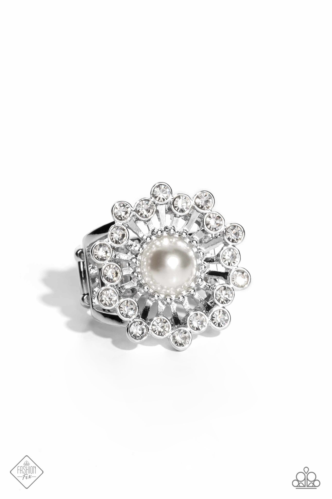 Exploding around an exaggerated white pearl center, radiant white gems stack in a sunburst-like pattern for a glitzy, elegant centerpiece atop the finger. Features a stretchy band for a flexible fit.
