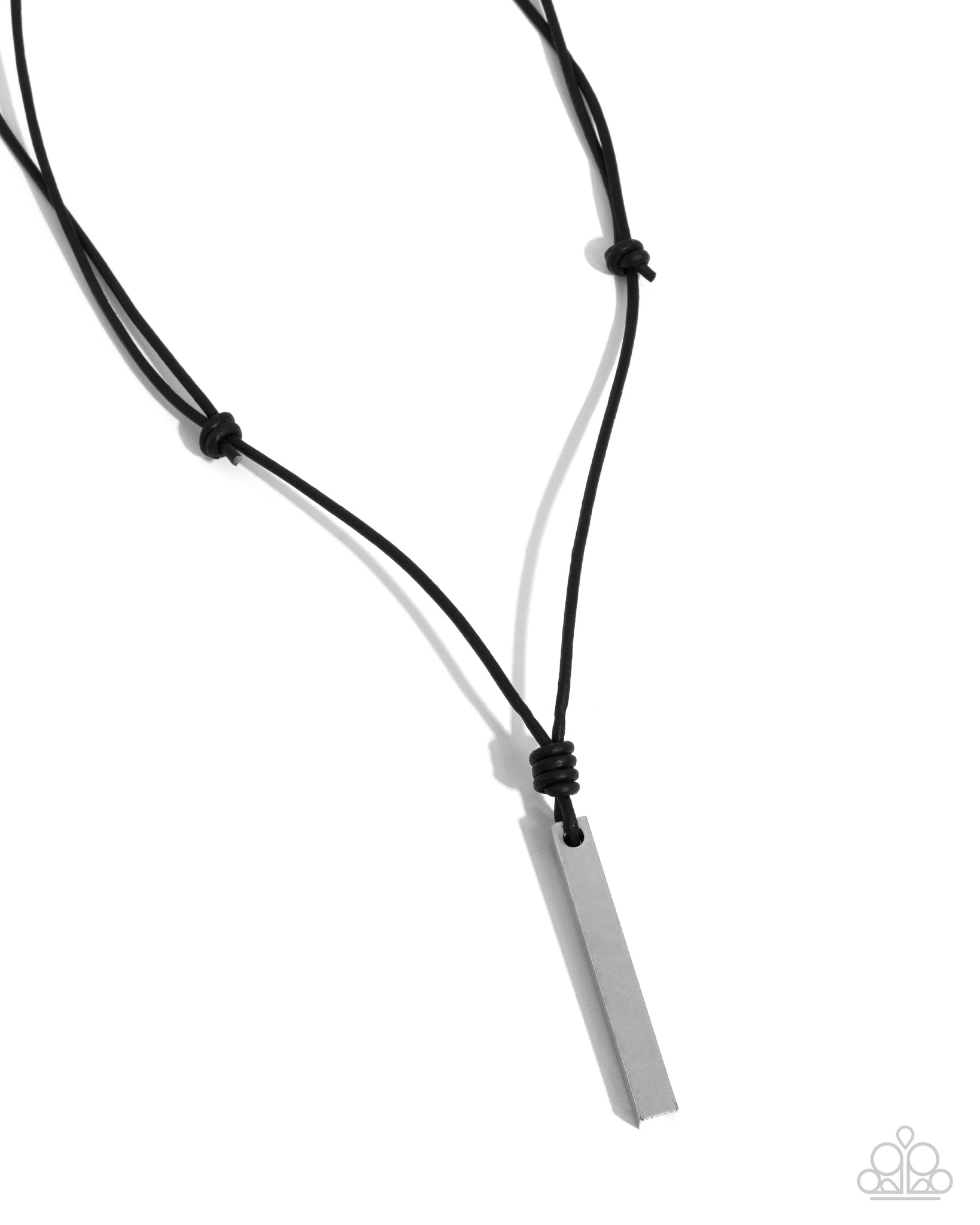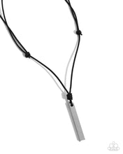 A rectangular silver pendant is knotted in place along a black suede cord, resulting in an edgy pendant. Features an adjustable sliding knot closure.