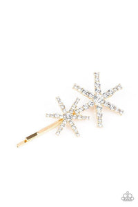 A pair of glittery white rhinestone encrusted gold stars dot the front of a classic bobby pin for a stellar look. Sold as one individual decorative bobby pin.