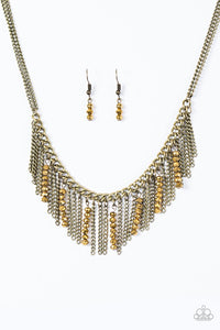 Threaded along metallic rods, stacks of aurum beading trickle from the bottom of a brass chain. The glittery accents trickle between trestles of brass chains, creating a fierce fringe below the collar. Features an adjustable clasp closure.