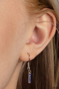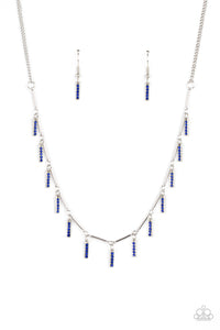 Dotted in stacks of glittery blue rhinestones, dainty silver rectangular frames drip between shiny silver bars along the collar, creating a dainty fringe. Features an adjustable clasp closure.