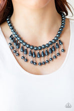 Pearly blue teardrop beads link with classic blue pearls as they drip from a timeless strand of blue pearls. Sprinkled with dainty crystal-like accents, the refined fringe cascades below the collar for a glamorous finish. Features an adjustable clasp closure.