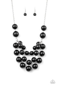 Three strands of bubbly black beads cascade below the collar, creating colorful layers. Features an adjustable clasp closure.