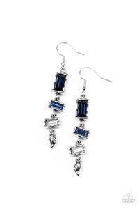 Featuring hammered silver frames, emerald cut dark blue, blue, and white rhinestones stack into an edgy lure. Dotted in glassy white rhinestones, a dainty silver teardrop attaches to the bottom for an abstract finish. Earring attaches to a standard fishhook fitting.
