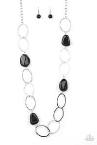 Featuring a faux rock finish, faceted black beads join hammered silver hoops across the chest for a seasonal look. Features an adjustable clasp closure.