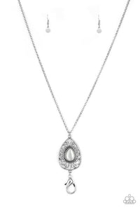A glowing white moonstone is pressed into the center of a silver teardrop pendant swirling with regal filigree for a regal finish. A lobster clasp hangs from the bottom of the design to allow a name badge or other item to be attached. Features an adjustable clasp closure.