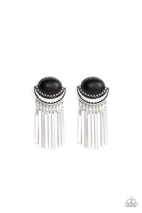 A smooth black stone is pressed into the top of a silver studded half-moon frame. Flat silver rods swing from the bottom of the earthy frame, for a noise-making finish. Earring attaches to a standard post fitting.