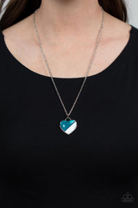 Encased in a silver heart frame, a glassy Harbor Blue bead and white shell-like stone lay side-by-side, creating a romantic pendant at the bottom of a classic silver chain. Features an adjustable clasp closure.
