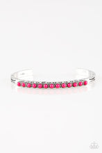Dainty pink beads are encrusted along the center of a dainty silver cuff stamped in tribal inspired patterns for a seasonal look.