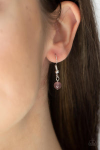 A glowing purple cat's eye stone encased in a simple round silver frame sits atop an airy silver hoop. A silver chain tassel sways from the bottom for a whimsically gleaming pendant at the end of a lengthened silver chain. Features an adjustable clasp closure.
