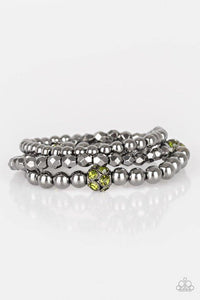 Mismatched gunmetal beads and green rhinestone encrusted beads are threaded along stretchy bands for an edgy and refined look.