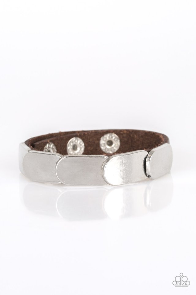 Overlapping silver frames are studded in place across a skinny brown leather band for a rugged look Features an adjustable snap closure.
