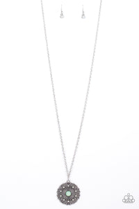Dotted in dainty opalescent beads, stacks of whimsical silver petals bloom from a Green Ash beaded center, creating a decorative floral pendant at the bottom of a lengthened silver chain. Features an adjustable clasp closure.