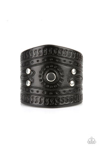 Dotted in shiny silver studs, a triangular piece of black leather is stamped in indigenous inspired patterns for an urban flair. Features an adjustable snap closure.