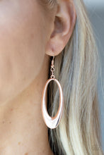 Featuring a flared bottom, a rose gold oval frame swings from the ear for a classic metallic finish. Earring attaches to a standard fishhook fitting.