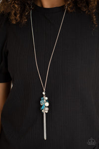 A fabulous collision of blue crystal-like beads, white rhinestones, white pearls, and ornate silver beads delicately cluster at the bottom of a lengthened silver chain for a colorfully vintage look. A silver chain tassel swings from the bottom of the display, adding a flirtatious movement to the whimsical piece. Features an adjustable clasp closure.