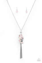 A fabulous collision of pink crystal-like beads, white rhinestones, white pearls, and ornate silver beads delicately cluster at the bottom of a lengthened silver chain for a colorfully vintage look. A silver chain tassel swings from the bottom of the display, adding a flirtatious movement to the whimsical piece. Features an adjustable clasp closure.