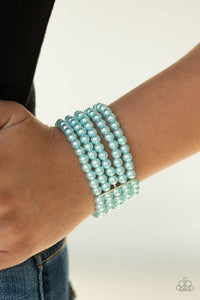 Threaded through glistening silver fittings, strand after strand of dainty blue pearls are threaded along stretchy bands around the wrist for a timelessly stacked look.