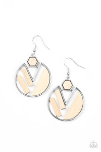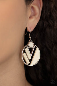 Flat white wooden frames collect inside a geometric sliver fitting for a trendy fashion. Earring attaches to a standard fishhook fitting.