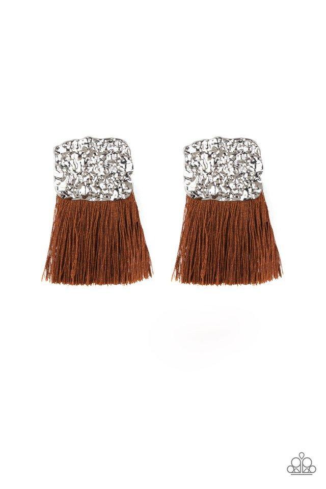 A plume of shiny brown thread streams from the bottom of a hammered silver frame, creating a bold tasseled look. Earring attaches to a standard post fitting.