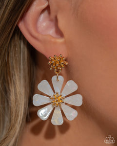 A collection of tactile gold studs gives way to an acrylic, pastel-patterned white flower that also blooms around a gold studded center, infusing the design with whimsical, soft movement. Earring attaches to a standard post fitting.