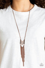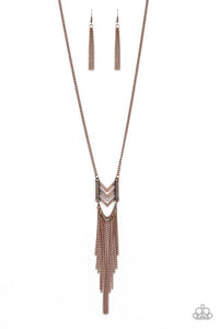 A stacked chevron-like frame swings from the bottom of a lengthened copper chain, giving way to a shimmery copper tassel for a tribal inspired look. Features an adjustable clasp closure.