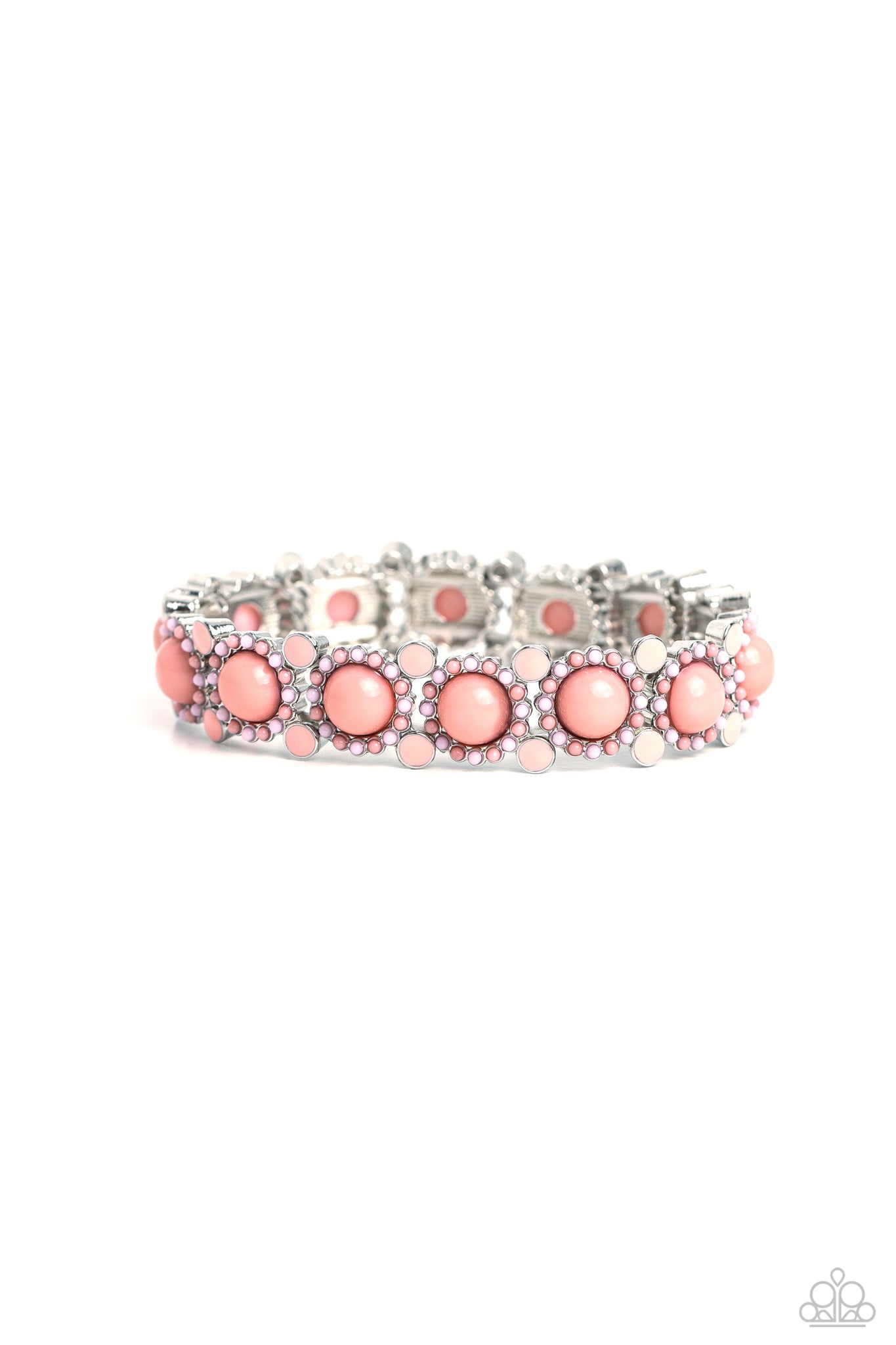 Dotted in glossy Peach Pink beaded centers, baby pink and Peach Pink beaded silver floral frames delicately link around the wrist on stretchy bands for a whimsical arrangement. Separating each floral display, additional Peach Pink beads pressed in thick scalloped fittings continue the bright cheerful motif.