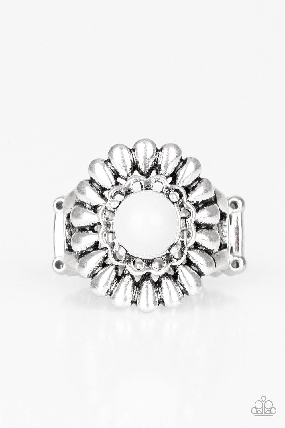 A shiny white bead is nestled atop a stacked floral frame, creating a colorful flower atop the finger. Features a stretchy band for a flexible fit.